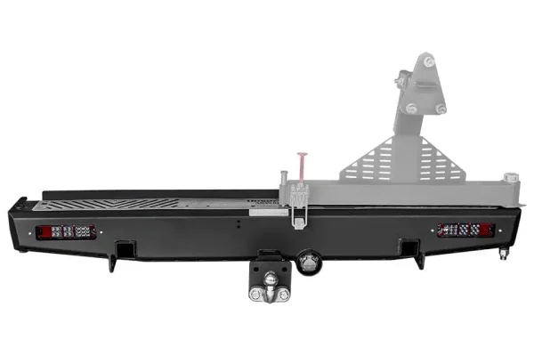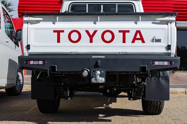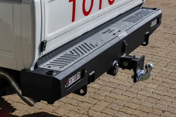 Rugged and reliable, this rear bar enhances your Land Cruiser 79 Series with LED tail lights, recovery points, jacking points, a protected trailer plug, Anderson Connector mount, removable tow hitch, and mounts for an optional wheel carrier on either side